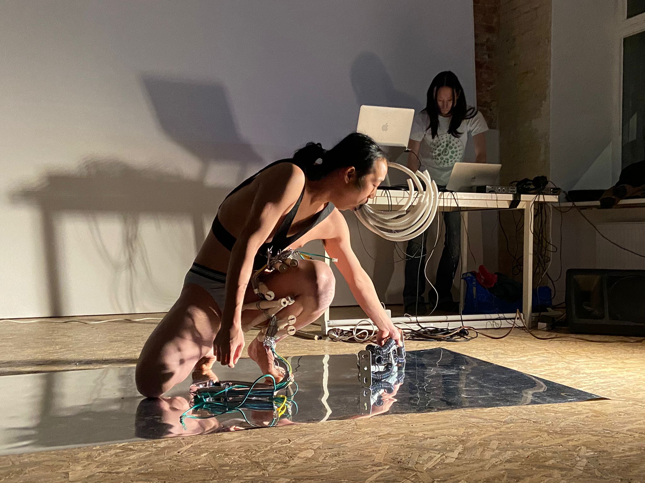 In the second scene, the performer removes the exoviscus, exposing the bare body. Physical impacts, self-inflicted are transformed into sound in real time, triggering generative music through live touchpad interaction by a second performer. The body becomes both source and instrument, collapsing the boundary between action and reaction, between what is observed and what is felt.